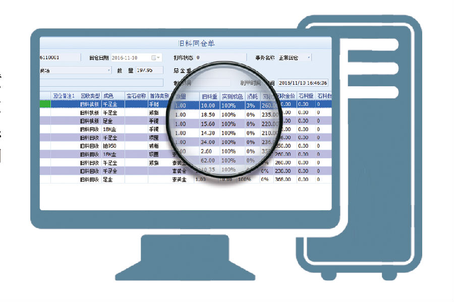 舊金回收:對于經(jīng)營(yíng)素金類(lèi)的企業(yè),記錄銷(xiāo)售點(diǎn)回收舊品(包括黃金等)信息數據,記錄回收類(lèi)型的、飾品款型、成色、原始質(zhì)量、抵扣質(zhì)量等。在收銀過(guò)程對應收款進(jìn)行相應的抵扣。系統可以按商場(chǎng)、類(lèi)型、重量進(jìn)行分類(lèi)統計。同時(shí)根據舊金回收生成相應的舊金回倉(總部)單據。